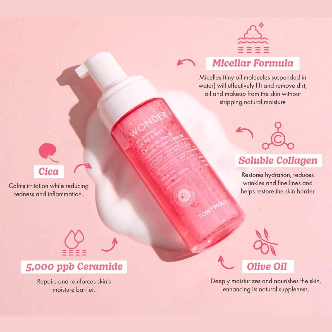 ¡Logra una piel tan suave y tersa como un mochi con nuestro limpiador en espuma suave Wonder Ceramide Mochi! La fórmula de espuma suave es lo suficientemente suave incluso para los tipos de piel más sensibles y, al mismo tiempo, le brinda poderosos beneficios de ingredientes como ceramidas, colágeno, niacinamida, extracto de centella asiática (cica), extracto de hoja de aloe y aceite de oliva.